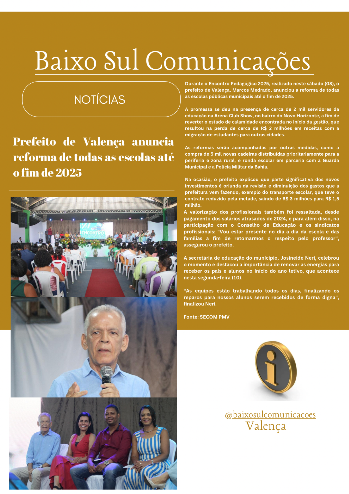Durante o Encontro Pedagógico 2025, realizado neste sábado (08), o prefeito de Valença, Marcos Medrado, anunciou a reforma de todas as escolas públicas municipais até o fim de 2025.