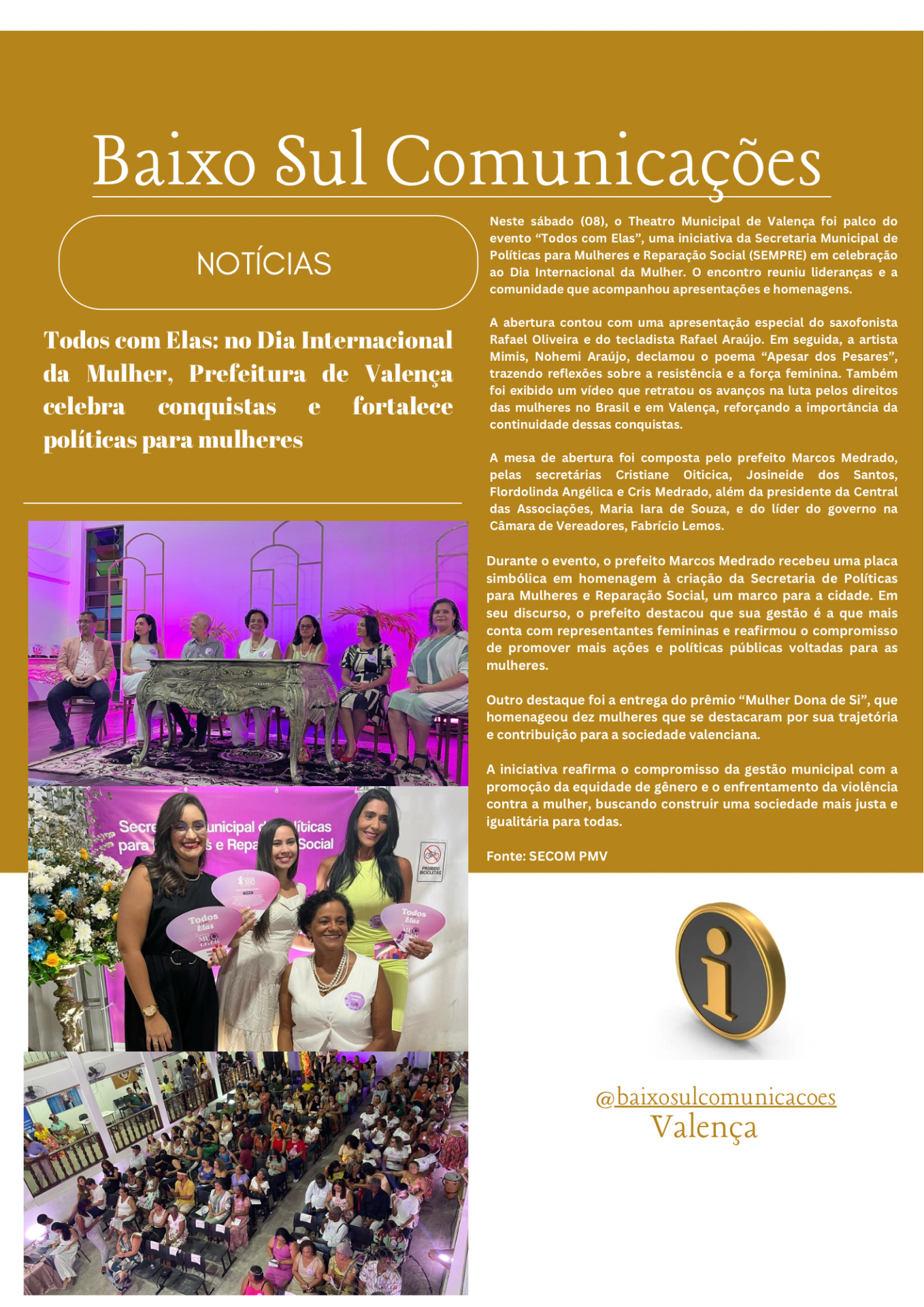 Neste sábado (08), o Theatro Municipal de Valença foi palco do evento "Todos com Elas", uma iniciativa da Secretaria Municipal de Políticas para Mulheres e Reparação Social (SEMPRE) em celebração ao Dia Internacional da Mulher. O encontro reuniu lideranças e a comunidade que acompanhou apresentações e homenagens.