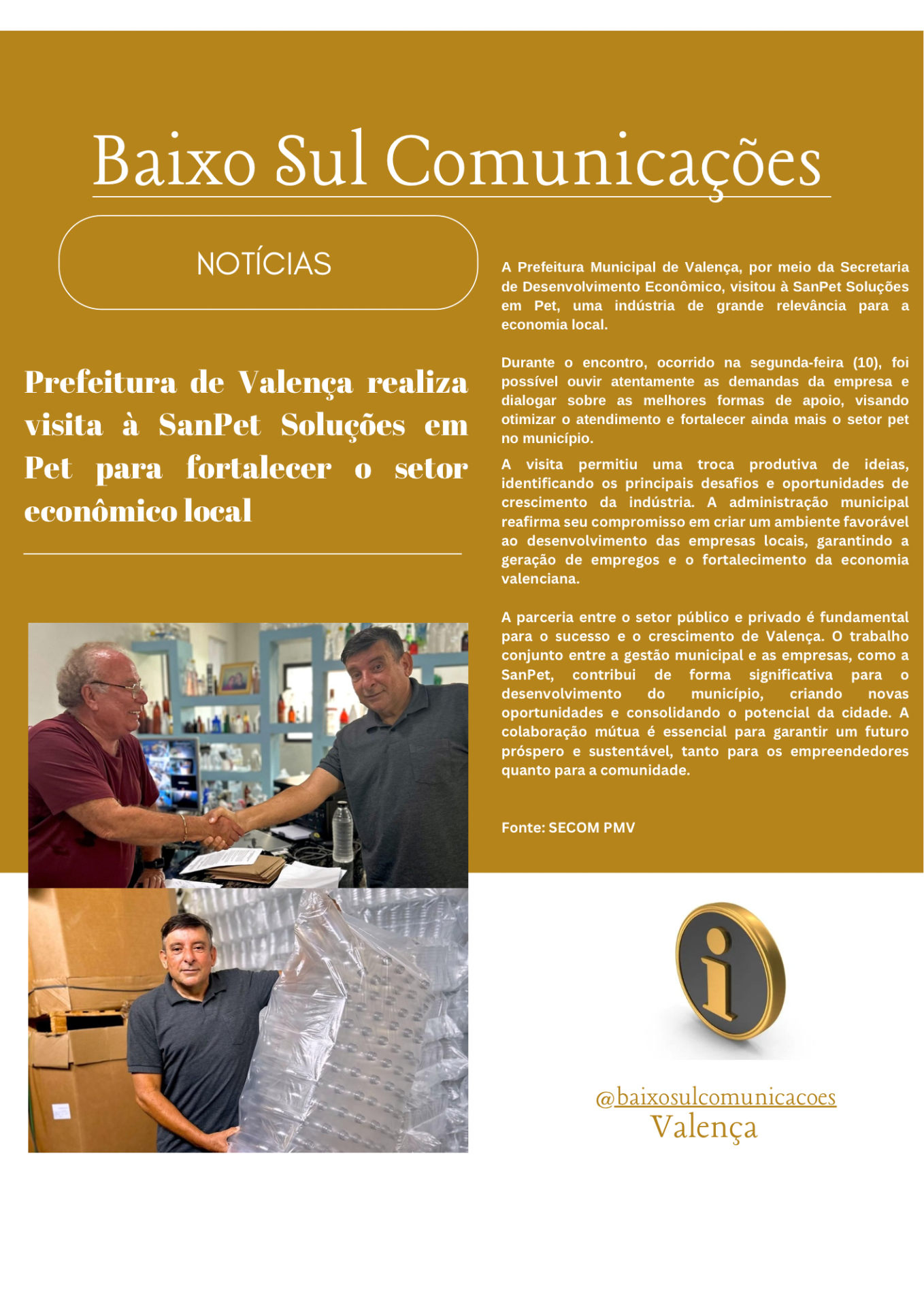 A Prefeitura Municipal de Valença, por meio da Secretaria de Desenvolvimento Econômico, visitou à SanPet Soluções em Pet, uma indústria de grande relevância para a economia local.