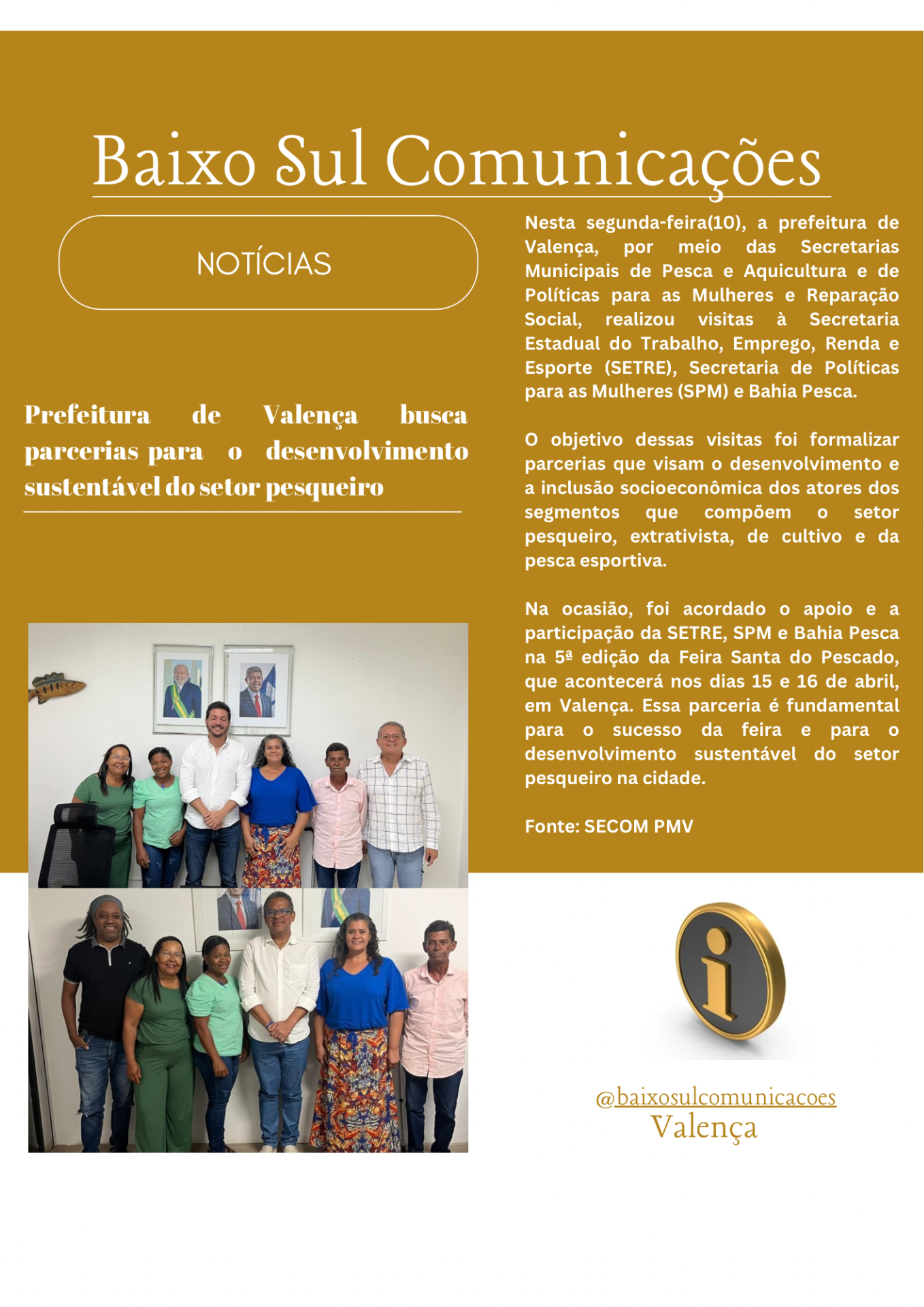 Nesta segunda-feira(10), a prefeitura de Valença, por meio das Secretarias Municipais de Pesca e Aquicultura e de Políticas para as Mulheres e Reparação Social, realizou visitas à Secretaria Estadual do Trabalho, Emprego, Renda e Esporte (SETRE), Secretaria de Políticas para as Mulheres (SPM) e Bahia Pesca.