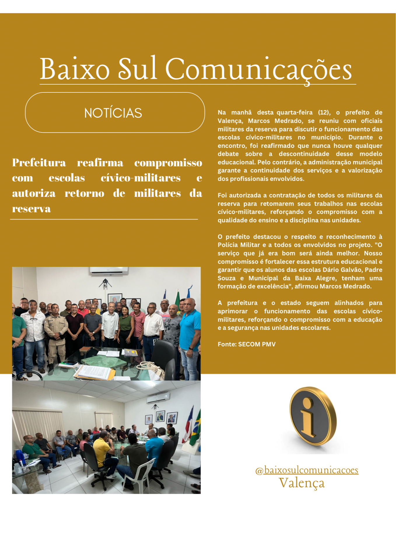Na manhã desta quarta-feira (12), o prefeito de Valença, Marcos Medrado, se reuniu com oficiais militares da reserva para discutir o funcionamento das escolas cívico-militares no município. Durante o encontro, foi reafirmado que nunca houve qualquer debate sobre a descontinuidade desse modelo educacional. Pelo contrário, a administração municipal garante a continuidade dos serviços e a valorização dos profissionais envolvidos.