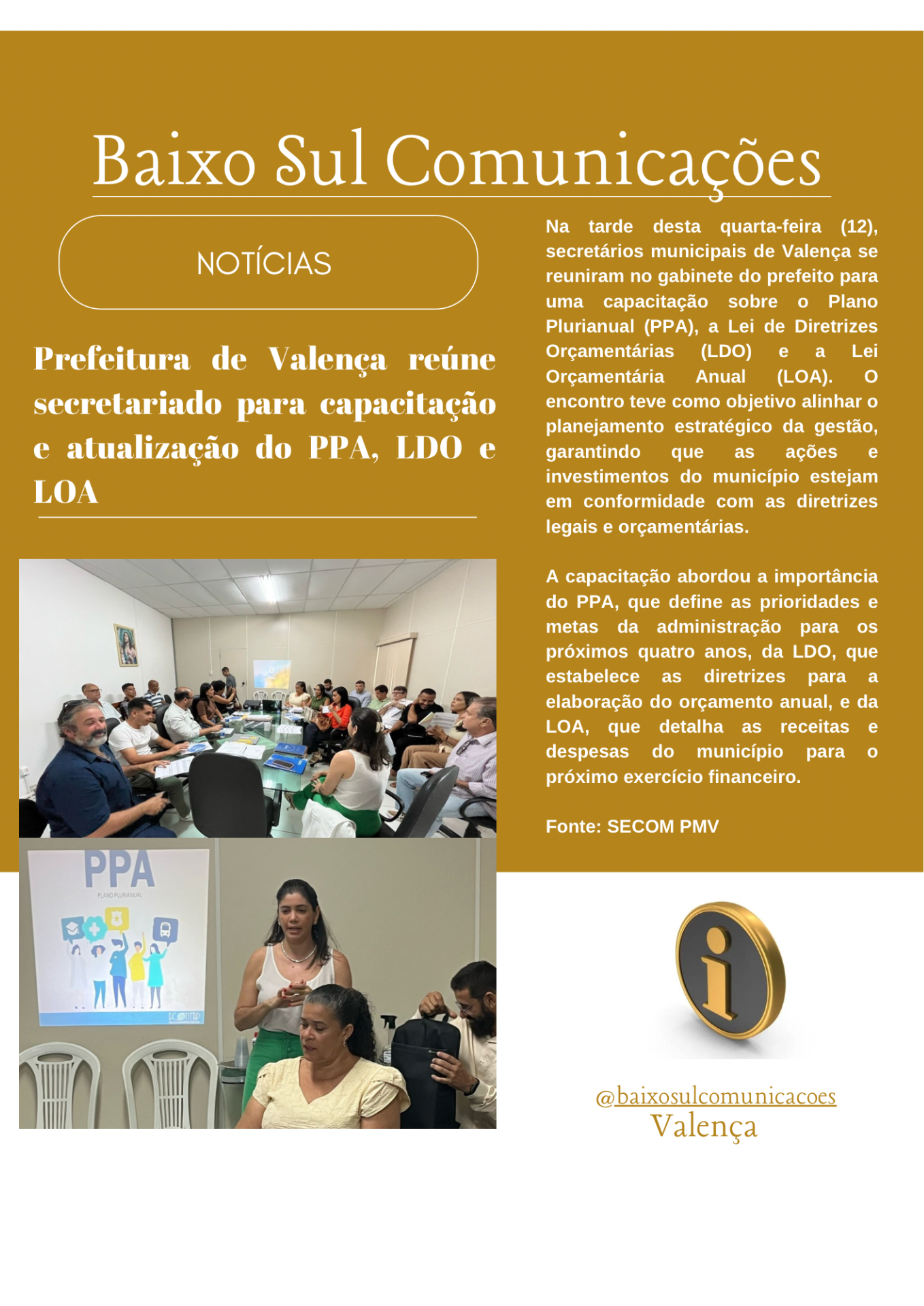 Na tarde desta quarta-feira (12), secretários municipais de Valença se reuniram no gabinete do prefeito para uma capacitação sobre o Plano Plurianual (PPA), a Lei de Diretrizes Orçamentárias (LDO) e a Lei Orçamentária Anual (LOA). O encontro teve como objetivo alinhar o planejamento estratégico da gestão, garantindo que as ações e investimentos do município estejam em conformidade com as diretrizes legais e orçamentárias.